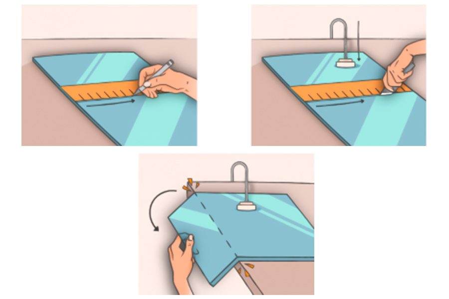 | Key steps | 1. Ruler positioning and marking 2. Repeat marking to 1/3-1/2 of the thickness of the plate 3. Align the scratches to the edge of the workbench 4. Press and hold + break quickly with force |